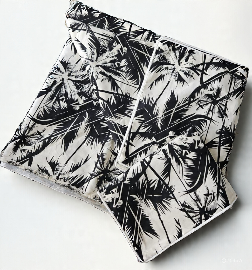 The bedsheet features a black and white tropical leaf pattern, with a repeating design of palm fronds in various orientations. The leaves are depicted in a stylized manner, with bold black lines and subtle shading that gives the impression of depth and texture. The overall effect is one of calmness and serenity, evoking the feeling of a relaxing getaway to a tropical paradise.